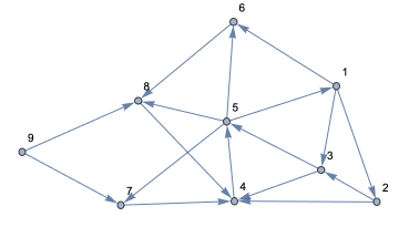 E42={{1,2},{1,3},{1,6},{2,3},{2,4},{3,4},{3,5},{4,5},{8,4},{5,1},{5,6},{5,7},{5,8},{6,8},{7,4},{9,7},{9,8}};gE42=Graph[E42,DirectedEdgesTrue,ImagePadding10,VertexLabels"Name"]