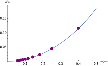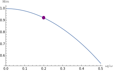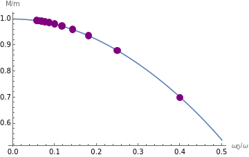 ;,{ω,ωmin,ωmax,Δω}Superimposing the exact solution for Ω/ω and M/m as functions of /ω, to the numerical one, we obtain the following plot
