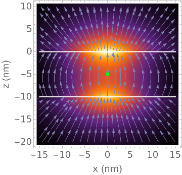 (*MAGNETICFIELDStreamDensityPlot*)xmin=-15;(*Plotlimitsinnm*)xmax=15;zmin=-20;zmax=10;StreamDensityPlot[BfieldnmmT[x,z],{x,xmin,xmax},{z,zmin,zmax},FrameTrue,FrameLabel{"x (nm)","z (nm)"},LabelStyleDirective[FontFamily"Helvetica",18],StreamScale{0.1,Automatic,0.025},StreamStyleDirective[Thickness[0.004],RGBColor[0.5,0.5,0.7],AntialiasingTrue],ColorFunctionColorData["SunsetColors"],AspectRatioAutomatic,Epilog{Thick,White,Line[{{xmin,0},{xmax,0}}],Line[{{xmin,-ww*ban*10^9},{xmax,-ww*ban*10^9}}],PointSize[0.025],Green,Point[{{0,lq0*zz0*ban*10^9}}]}]