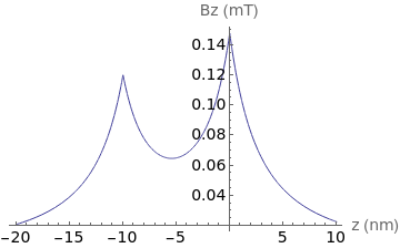 (*Cross-sectionofBzalongthezaxis*)zmin=-20;(*Plotlimitsinnm*)zmax=10;Plot[teslaG*1000*Bfield[0*10^-9/ban,z*10^-9/ban][[2]],{z,zmin,zmax},PlotRangeAll,AxesLabel{"z (nm)","Bz (mT)"},LabelStyleDirective[FontFamily"Helvetica",14]]