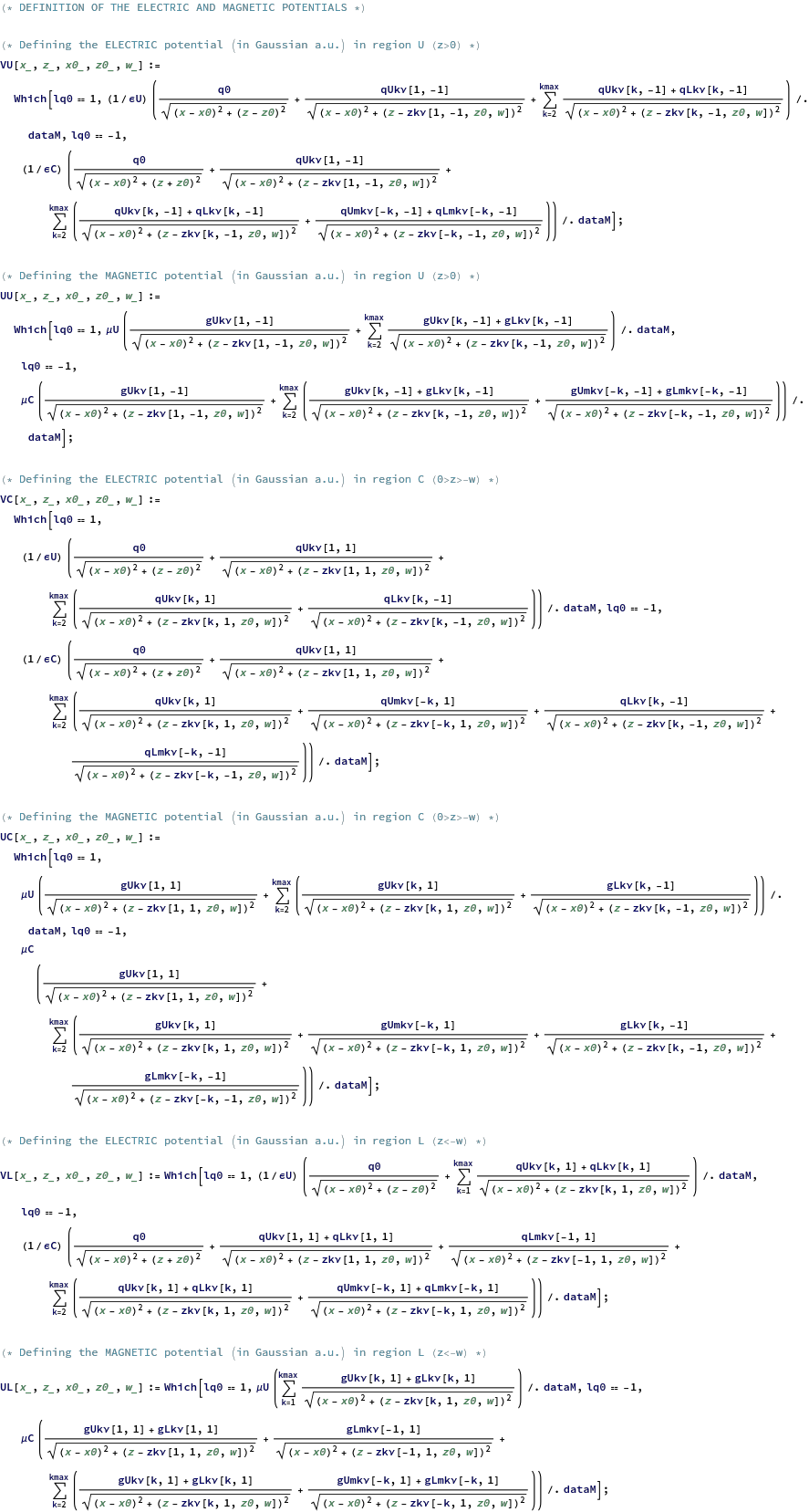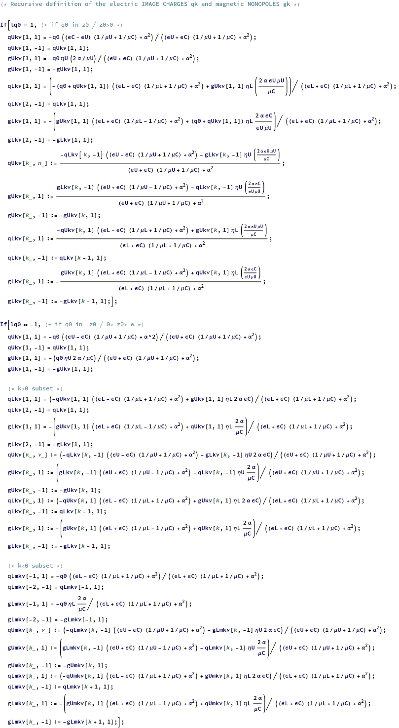 (*Particularizationoftheelectricchargesandmagneticmonopolesforthematerials'parametersindataM*)i=1;qUkν[i,1]=qUkν[i,1]/.dataM;qUkν[i,-1]=qUkν[i,-1]/.dataM;gUkν[i,1]=gUkν[i,1]/.dataM;gUkν[i,-1]=gUkν[i,-1]/.dataM;qLkν[i,1]=qLkν[i,1]/.dataM;gLkν[i,1]=gLkν[i,1]/.dataM;For[i=2,i≤kmax,i++,qUkν[i,1]=qUkν[i,1]/.dataM;qUkν[i,-1]=qUkν[i,-1]/.dataM;gUkν[i,1]=gUkν[i,1]/.dataM;gUkν[i,-1]=gUkν[i,-1]/.dataM;qLkν[i,1]=qLkν[i,1]/.dataM;qLkν[i,-1]=qLkν[i,-1]/.dataM;gLkν[i,1]=gLkν[i,1]/.dataM;gLkν[i,-1]=gLkν[i,-1]/.dataM;]If[lq0-1,(*ifq0in-z0/0>-z0>-w*)i=-1;qLmkν[i,1]=qLmkν[i,1]/.dataM;gLmkν[i,1]=gLmkν[i,1]/.dataM;For[i=2,i≤kmax,i++,qUmkν[-i,1]=qUmkν[-i,1]/.dataM;qUmkν[-i,-1]=qUmkν[-i,-1]/.dataM;gUmkν[-i,1]=gUmkν[-i,1]/.dataM;gUmkν[-i,-1]=gUmkν[-i,-1]/.dataM;qLmkν[-i,1]=qLmkν[-i,1]/.dataM;qLmkν[-i,-1]=qLmkν[-i,-1]/.dataM;gLmkν[-i,1]=gLmkν[-i,1]/.dataM;gLmkν[-i,-1]=gLmkν[-i,-1]/.dataM;];];