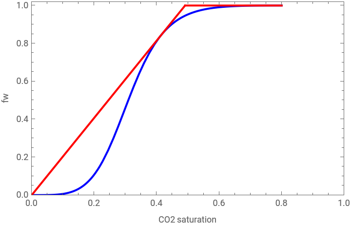 Plot[{fw,Schock},{Sw,Scw,1-Sor},FrameTrue,AxesFalse,PlotRange{{0,1},{0,1.02}},PlotStyle{RGBColor[0,0,1],RGBColor[1,0,0]},FrameLabel{"CO2 saturation","fw"}]