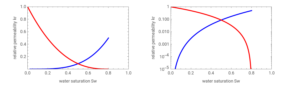 relpermlogplot=LogPlot[{krw,kro},{Sw,Scw,1-Sor},FrameTrue,AxesFalse,PlotRange{{0,1},{10^(-5),1}},PlotStyle{RGBColor[0,0,1],RGBColor[1,0,0]},FrameLabel{"water saturation Sw","relative permeability kr"}];