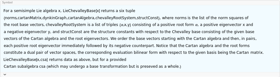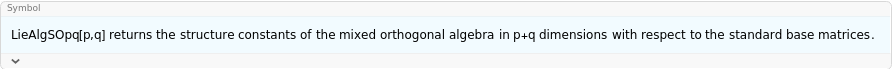 LieAlgSO[n] returns the structure constants of the special orthogonal algebra with respect to the standard basis. | |