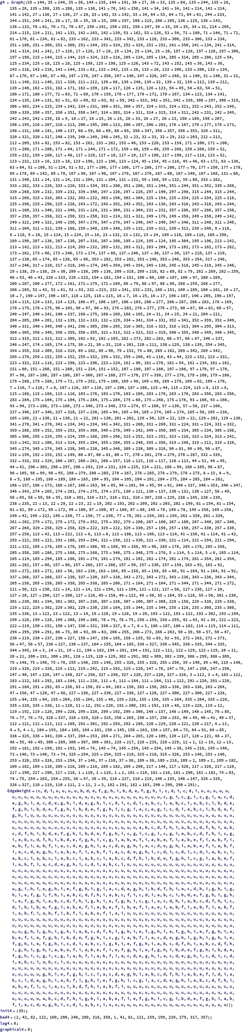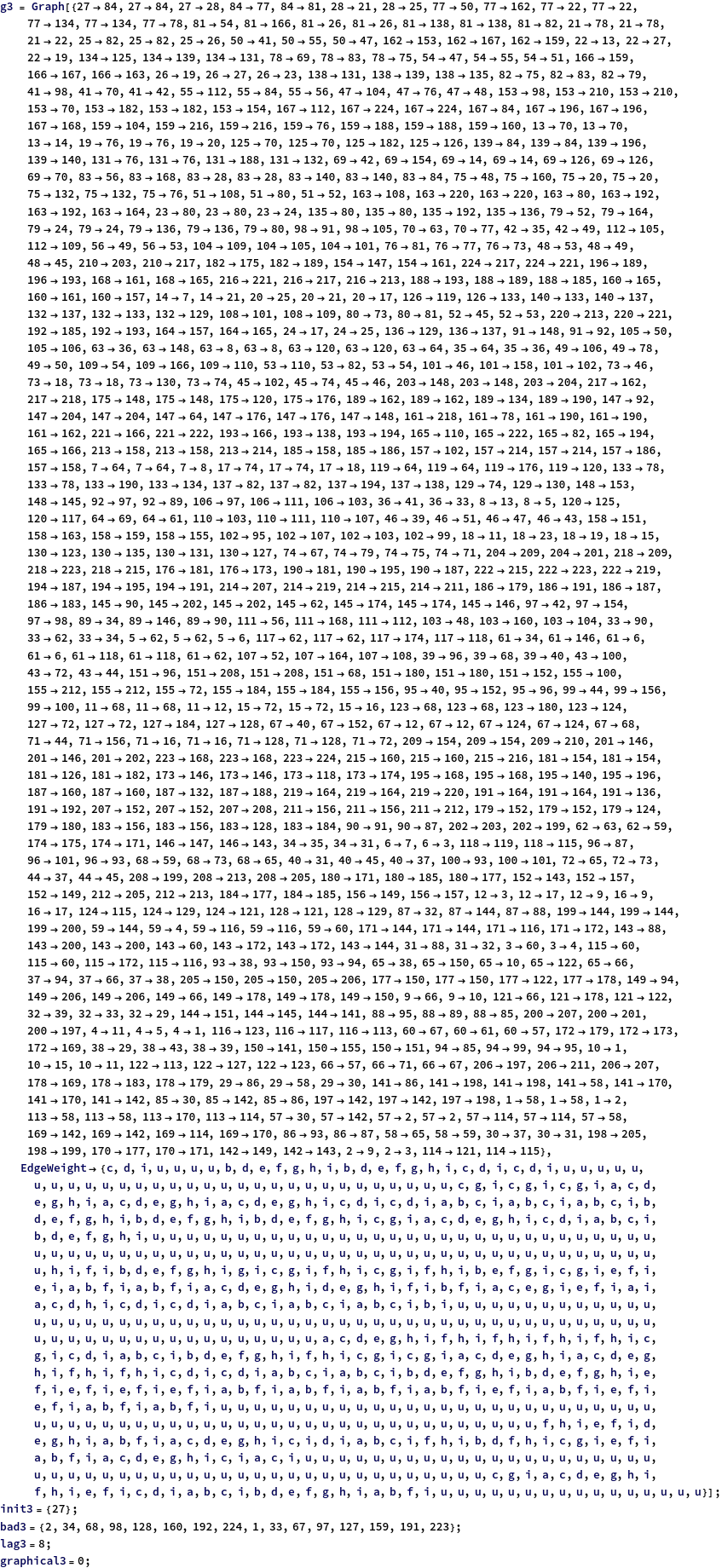 g2=Graph[{12,14,23,43,36,38,65,85,710,712,109,129,914,916,1411,1611,54,512,114,1112,83,811},EdgeWeight{a,b,u,u,a,b,u,u,b,a,u,u,b,a,u,u,b,a,a,b,u,u}];init2={1};bad2={2,6,10,14};lag2=4;graphical2=0;
