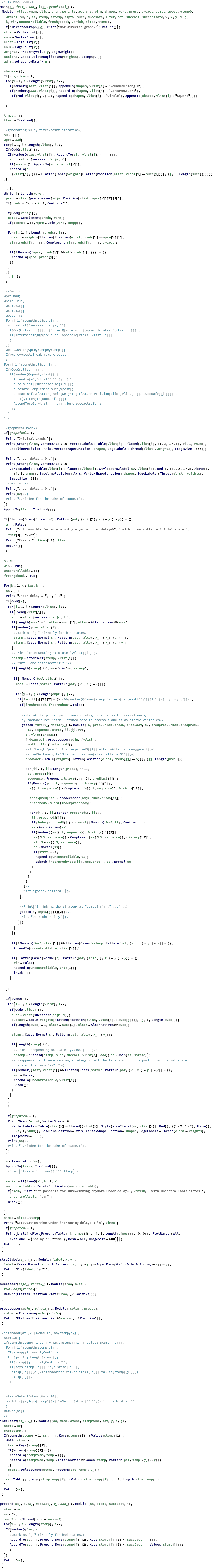(*gamegraph*)g1=Graph[{12,14,23,43,36,38,65,85,710,712,109,129,914,916,1411,1611,54,512,114,1112},EdgeWeight{a,b,u,u,a,b,u,u,b,a,u,u,b,a,u,u,b,a,a,b}];(*initialstate*)init1={1};(*unsafestates*)bad1={2,6,10,14};(*delay*)lag1=5;(*graphicalmode*)graphical1=1;