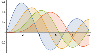 Plot[Evaluate[Table[BesselJ[n,x],{n,4}]],{x,0,10},FillingAxis]